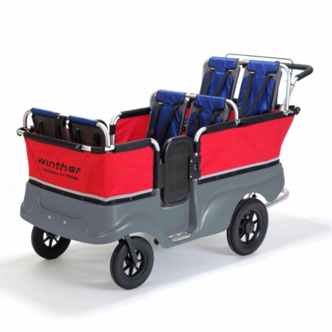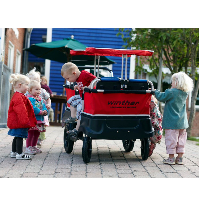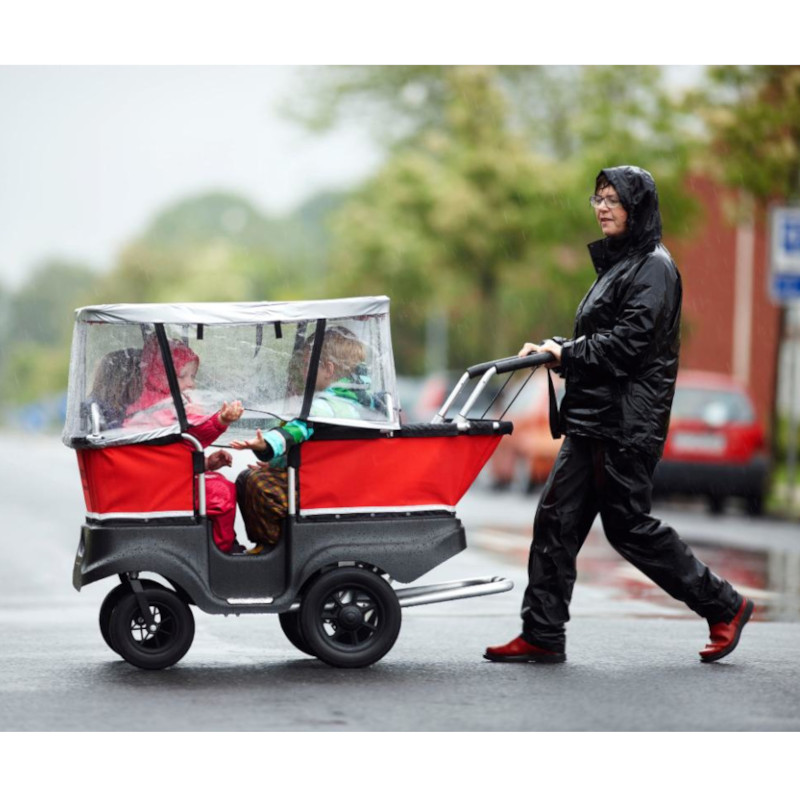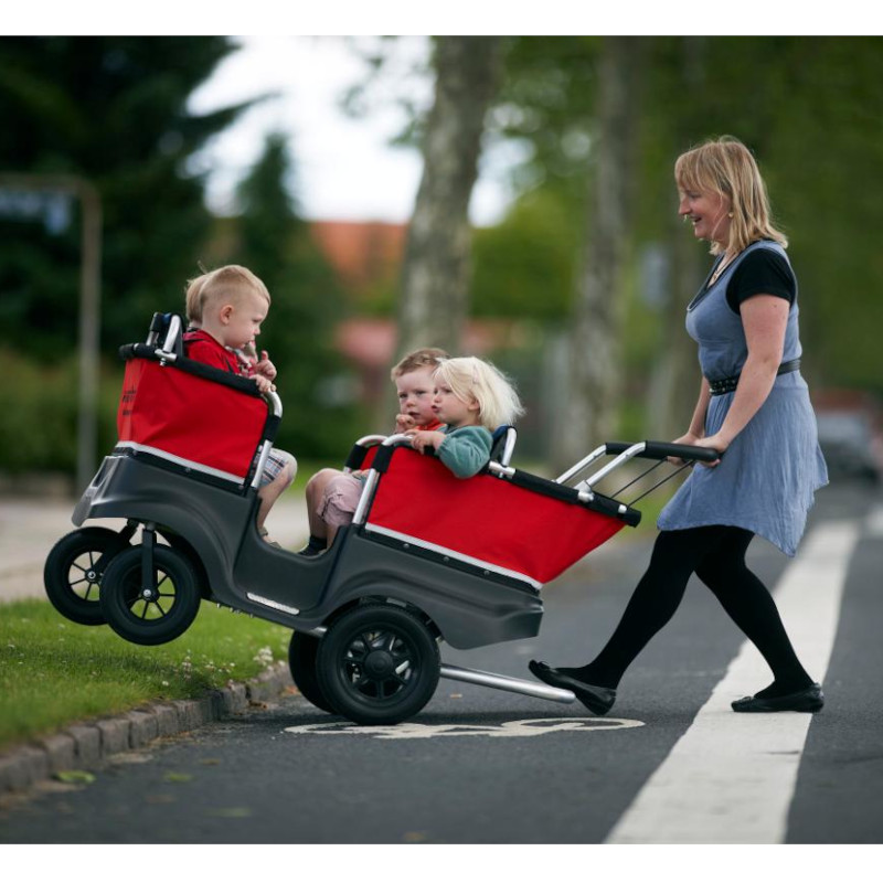 Jalutamisbussi vastupidav ja põhjalikult läbimõeldud disain keskendub turvalisusele, vastupidavusele ja ergonoomikale. Sellel on praktilised detailid ja piisavalt ruumi, et lapsed saaksid end vabalt tunda. Lapsed istuvad paarikaupa vastamisi, mis innustab sõpradega suhtlema. Sisse- ja väljapääs käib külgukse kaudu, täpselt nagu päris bussis. Jalutamisbussil on mugav käsipidurisüsteem ning istmed on varustatud turvarihmadega.
