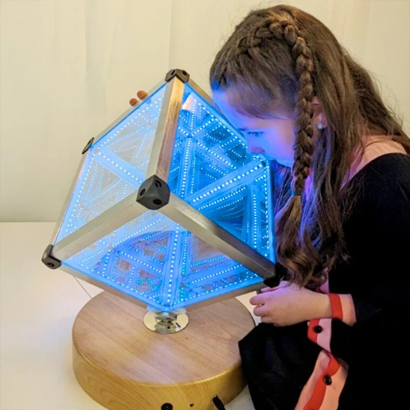 Peegelviimistlusega LED tuledega lõpmatuse kuubik (25 cm) muundub sisselülitamisel kütkestavaks valgustunneliks. Kuubikul on helitundlikkuse funktsioon (reageerib häälele või muusikale) ning kaasas on paljude lisavõimalustega pult. See 360 kraadi pöörlev kuubik pakub lummavat värvivalikut, mitmeid töörežiime ning reguleeritavat heledust. Lõpmatuse efekt loob täiusliku atmosfääri igasse sensoorsesse tuppa või keskkonda, lisades sügavust ja pakkudes visuaalset stimulatsiooni. Kaunil puidust alusel seisvat kuubikut on lihtne puhastada pehme kuiva lapiga.