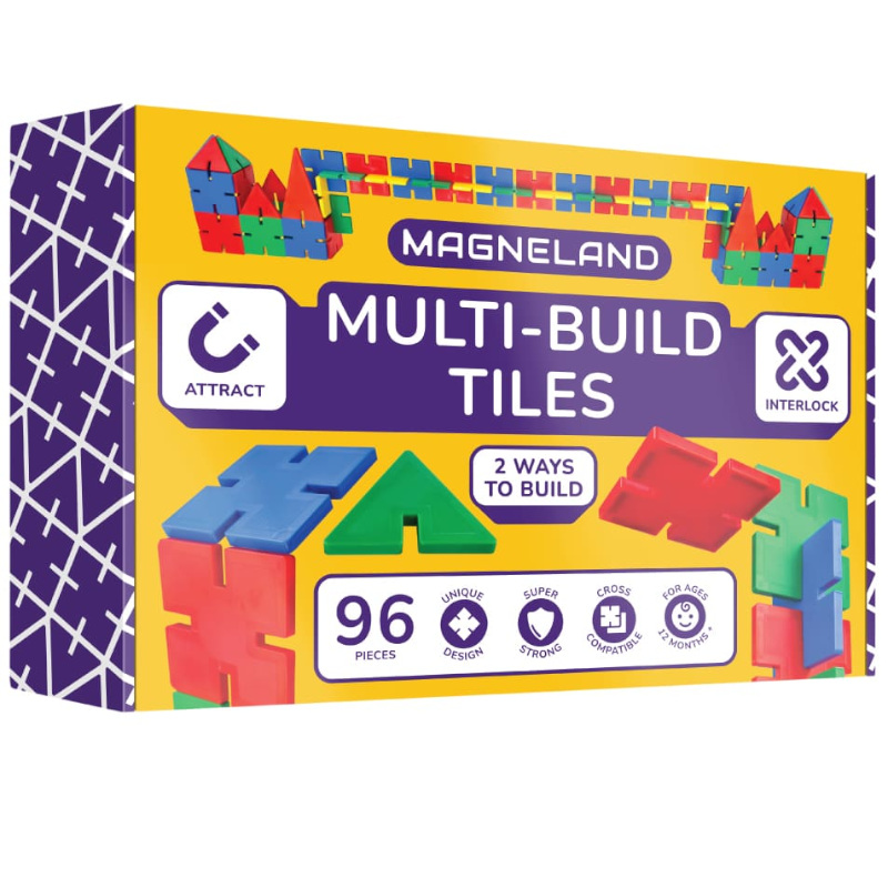 Magneland Multi-Build innovaatilised magnetilised vahvelklotsid (96 tk) pakuvad ehitamiseks kahte erinevat viisi – traditsioonilist magnetilist tõmbejõudu ning vahvelklotsidele omast omavahelist lukustussüsteemi. See üksteise sisse lukustuv disain võimaldab magnetplaatidel kokku lükates kindlalt haakuda, luues tugevamad ehitised, mis püsivad mängu ajal stabiilsena. Lapsed saavad oma ehitisi üles tõsta, kallutada ja liigutada, erinevalt tavalistest magnetklotsidest, mis toetuvad ainult tõmbejõule.