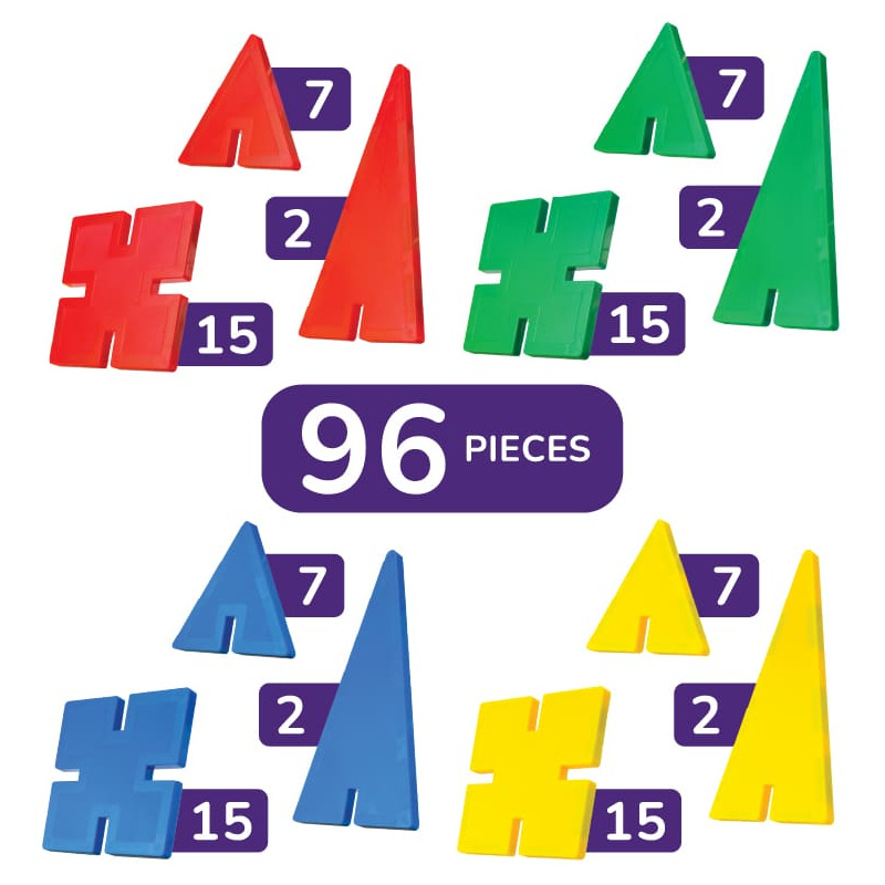 Komplektis on: 96 magnetilist plaati (60 ruutu, 28 võrdkülgset kolmnurka, 8 võrdhaarset kolmnurka)