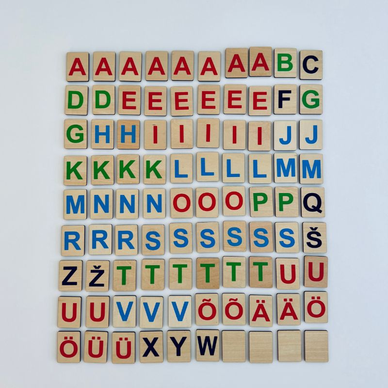 86 täheklotsi vastavalt nende esinemissagedusele Eesti sõnades: A – 8tk, B-1tk, C-1tk, D-2tk, E-6tk, F-1tk, G-2tk, H-2tk, I-5tk, J-2tk, K-4tk, L-4tk, M-3tk, N-3tk, O-3tk, P-2tk, Q-1tk, R-3tk, S-6tk, Š-1tk, Z-1tk, Ž-1tk, T-6tk, U-4tk, V-3tk, Õ-2tk, Ä-2tk, Ö-2tk, Ü-2tk, X-1tk, Y-1tk, W-1tk, lisaks 4 tühja magnetklotsi.
