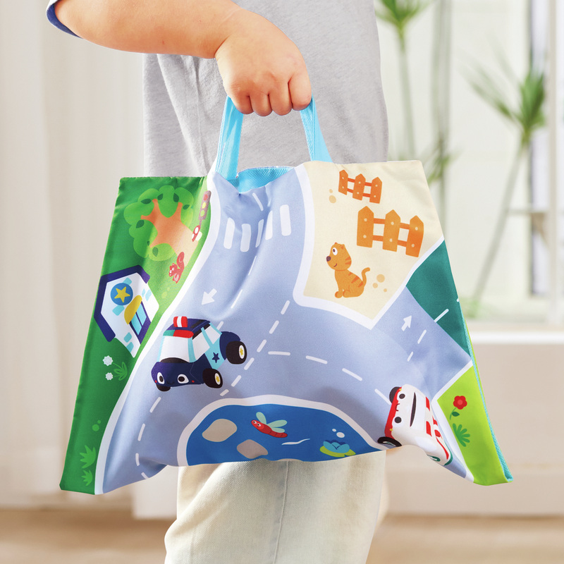MULTIFUNKTSIONAALNE HOIUKOTT: Kaasasolev kott täidab ka mängumati rolli, hoides sõidukid organiseerituna ja lisades mängule uue dimensiooni.