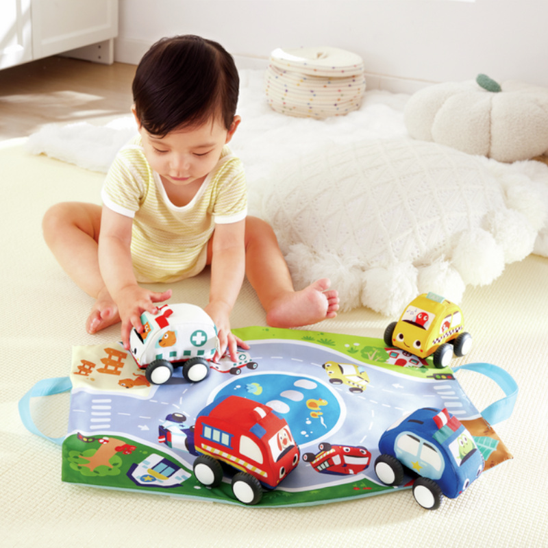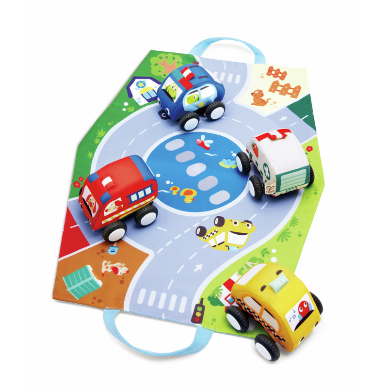 Anna mänguajale hoogu selle vahva pehmete autode komplektiga, kuhu kuuluvad tuletõrjeauto, politseiauto, kiirabiauto ja takso – igaüht neist juhib sõbralik loomategelane. Pehmed tagasitõmmatavad autod on valmistatud väikelastele ohutust materjalist ning varustatud vastupidavate tagasitõmmatavate mootoritega, mis panevad sõidukid vaikselt üle põranda vurama. Nutikas hoiukott käib lahti pehmeks mängumatiks, pakkudes autodele põnevat liikluskeskkonda ning muutes pärast mängu lõppu koristamise lihtsaks.
