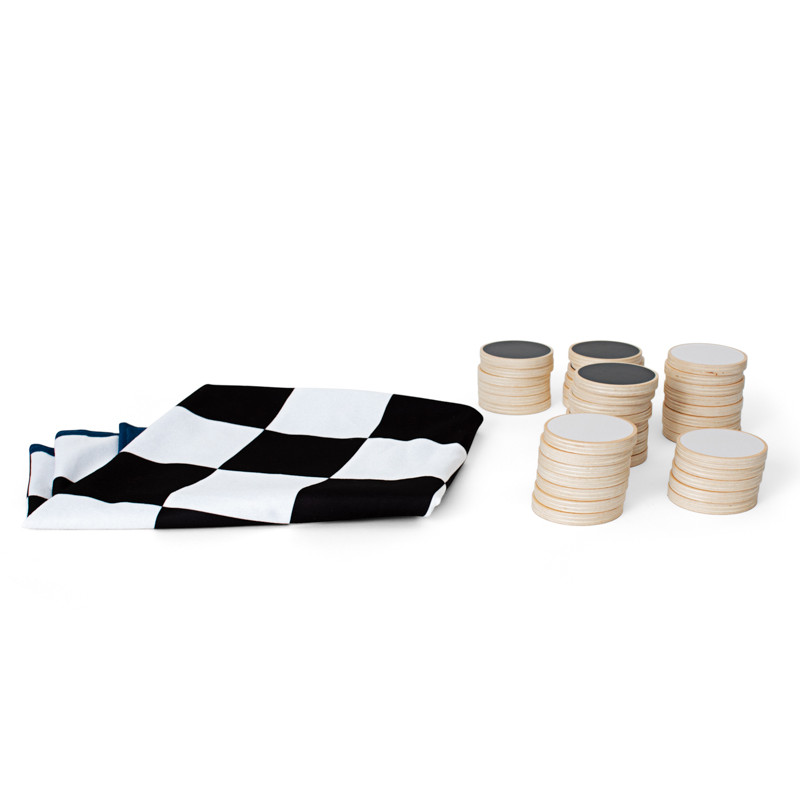 Komplekti kuulub: vastupidavast ja kergesti puhastatavast kangast mängualus, 4 metallist pulka mängualuse maapinnale kinnitamiseks, 40 puidust nuppu ja nööritav puuvillakott.