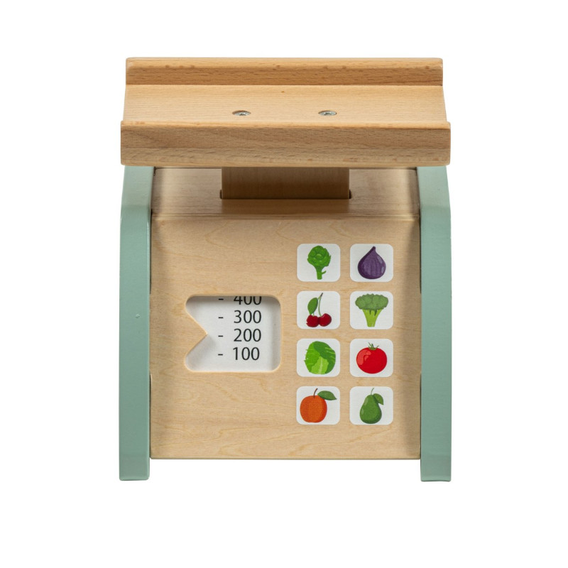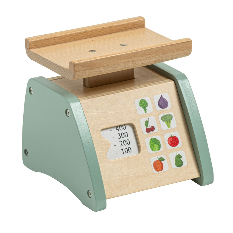 Kõigepealt kaalu ning siis valmista toit või osta kaupu! Aseta puidust kaal oma mängukööki, et mõõta toiduvalmistamisel õigeid koguseid, või kasuta seda mängupoes puu- ja köögiviljade kaalu ning hinna kontrollimiseks. Niipea, kui midagi kaalule asetad, liigub selle näidik – just nagu päris kaalul!
