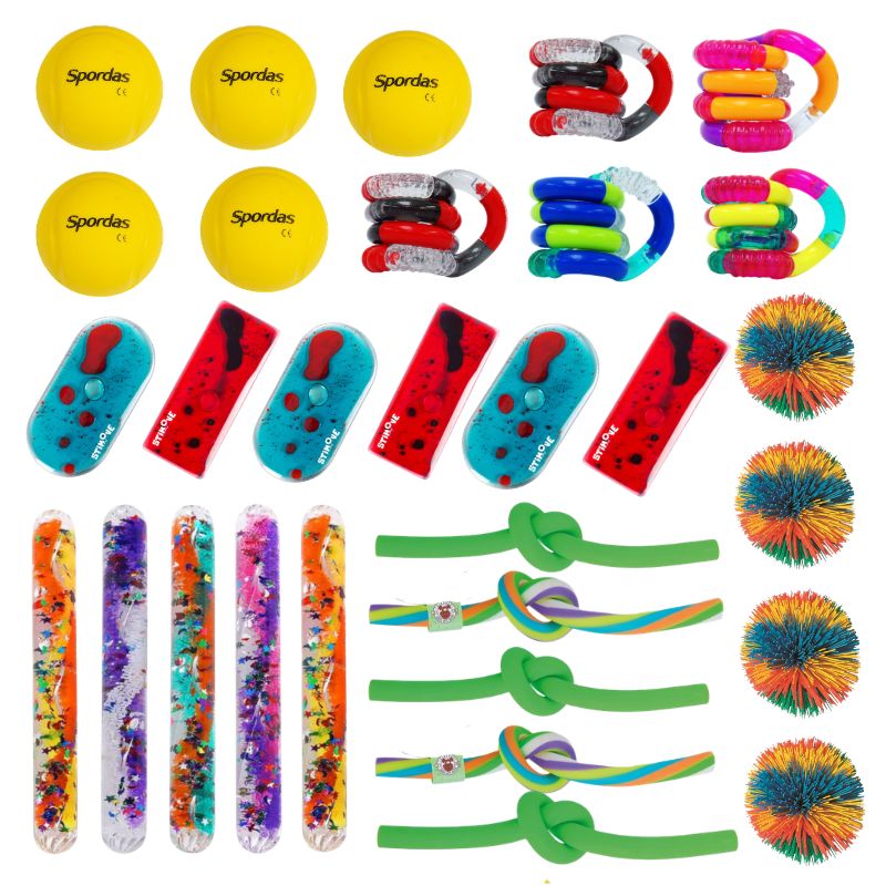 Sensoorikakomplekt erinevate sensoorsete mänguasjadega aitab lastel klassiruumis keskenduda. Lukustatava kaanega läbipaistvast karbist leiate kuute erinevat tüüpi mänguasju, millel kõigil on stressi leevendavad omadused, mis aitavad lastel keskenduda.