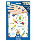 Pimedas helendavate tätoveeringute komplekt “Kosmos” sisaldab 2 lehte (14 X 21cm) tätoveeringuid kosmoserakettidest, planeetidest ja tähtedest.