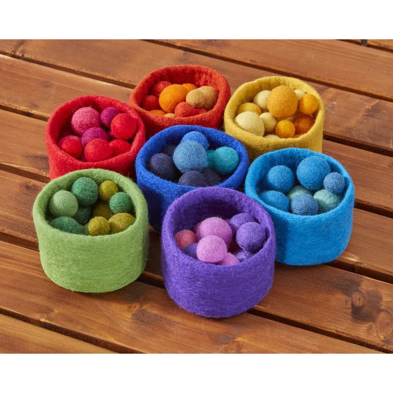 Komplekti kuulub: 7 vildist kaussi (7 x 11 cm) ja 100 vildist palli erinevates värvitoonides ja suurustes.